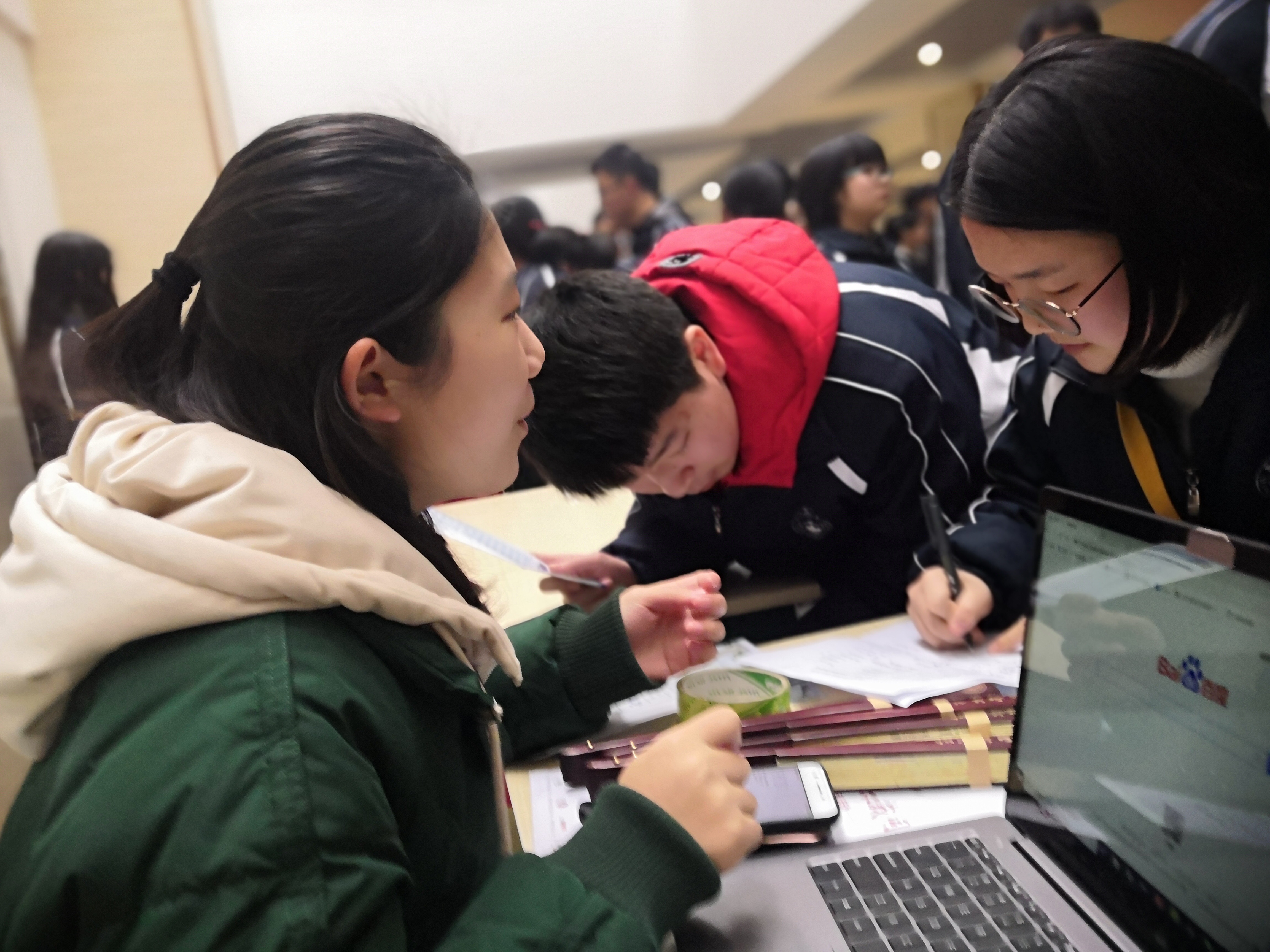 首先,小组成员们向前来咨询的高三学生们发放了印有学校招生简章的宣传册和印有西北大学校训的折扇、书签、明信片等精美小礼物。